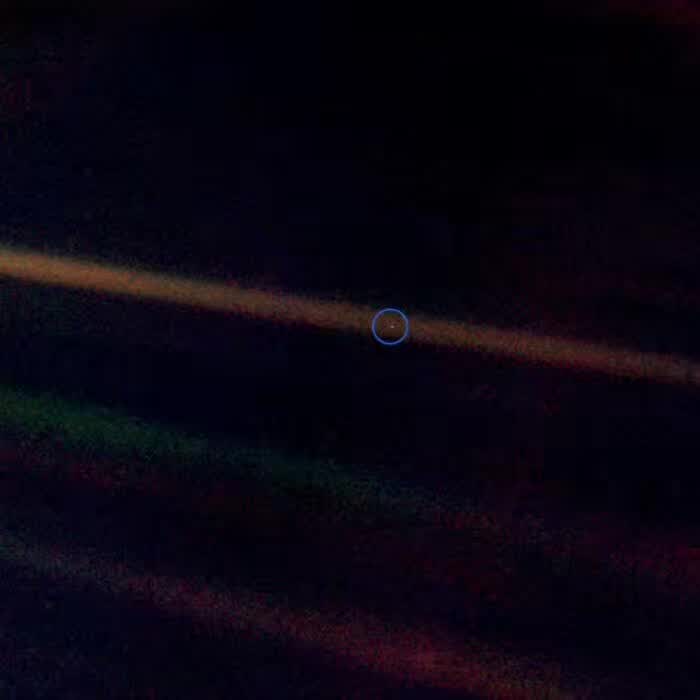这是一张著名的照片。1990年,旅行者1号(Voyager 1)探测器即将飞出太阳系的时候,在距离地球60亿公里的地方,美国国家航空航天局命令它回头再看一眼,拍摄了60张照片。照片上的光带是相机镜头反射的太阳光。其中的这一张上正好包括了地球 —— 就是图中那个亮点。